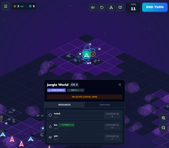 Each planet specializes in Gas, Metal, or Bio, influencing development paths, economic discounts, and strategic value. Colonizing a planet isn’t just expansion — it’s a commitment to defend and integrate it into your economy.